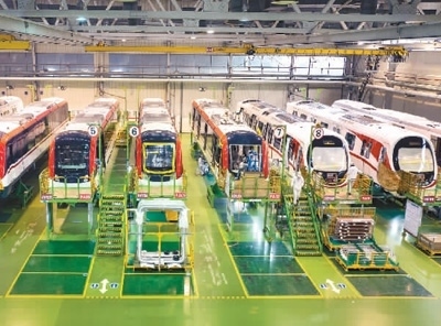 2023年2月14日,湖南省中車(chē)株洲電力機(jī)車(chē)有限公司城軌事業(yè)部總成車(chē)間,技術(shù)人員在加緊組裝城軌車(chē)輛,趕制國(guó)內(nèi)外客戶訂單。李 健攝(人民圖片)
