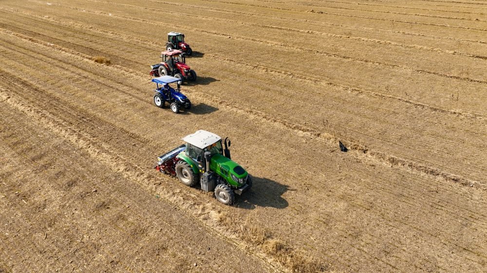 樂(lè)陵市來(lái)秋農(nóng)機(jī)服務(wù)專(zhuān)業(yè)合作社的四臺(tái)新式追肥機(jī)正在麥田進(jìn)行追肥作業(yè)。