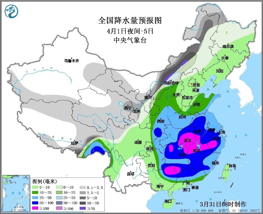 4月1日夜間至5日,甘肅東部、寧夏、河北北部和內(nèi)蒙古中東部等地有中到大雪或雨夾雪,內(nèi)蒙古中部等地局地暴雪或大暴雪,主要降雪時段為2日至3日;西北地區(qū)東南部、西南地區(qū)東部、江漢、江淮、江南、華南以及黃淮等地有中到大雨,其中河南東南部、湖北東部、湖南、安徽、江西、浙江西部、廣西北部、廣東北部和福建西部等地的部分地區(qū)有暴雨,局地大暴雨;主要降水時段為2日至4日。上述地區(qū)累計降水量20-50毫米,部分地區(qū)有70-120毫米,局地可達(dá)160毫米;100毫米以上降雨覆蓋面積達(dá)23萬平方公里。江淮及以南地區(qū)伴有短時強(qiáng)降水、雷暴大風(fēng)或冰雹等強(qiáng)對流天氣,最大小時降水量30-60毫米;江南北部、江漢東部、江淮等地伴有10級以上雷暴大風(fēng)。