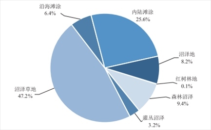 2022年度全國國土變更調查初步匯總結果顯示,全國共有濕地2357.3萬公頃。其中,紅樹林地2.9萬公頃,森林沼澤220.7萬公頃,灌叢沼澤75.4萬公頃,沼澤草地1112.9萬公頃,沿海灘涂149.9萬公頃,內(nèi)陸灘涂602.4萬公頃,沼澤地193.2萬公頃。