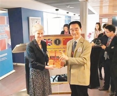 呂景泉(前右)向合作開設(shè)英國魯班工坊的英方學校代表贈送中方研發(fā)出版的教材。