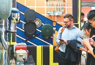第133屆廣交會,主辦方專門在客流量最大的展館主通道區(qū)域設(shè)置了一批中國工業(yè)設(shè)計展位。圖為境外采購商正在了解一家中國工業(yè)設(shè)計企業(yè)的廚房電器產(chǎn)品。新華社記者 劉大偉攝