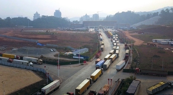 磨憨口岸新貨運(yùn)通道前,貨運(yùn)卡車排起長龍。