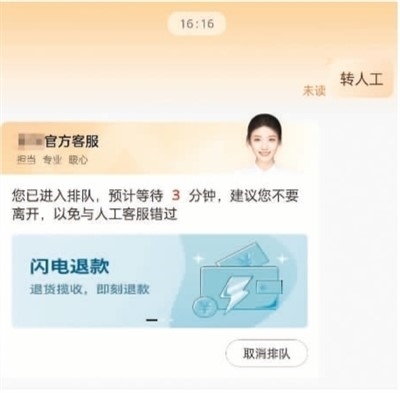 現(xiàn)實中,智能客服的出現(xiàn)的確提供了諸多便利,但當智能客服的標準化應(yīng)答無法解決遇到的具體問題時,更多用戶便轉(zhuǎn)向人工客服。然而,人工客服的接通率較低。有網(wǎng)友反映,即便通過排隊接入人工客服,有時為了提交信息退出聊天窗口后,又需重新排隊進入,而此時,人工客服已換人,之前提出的問題也需要重復(fù)表述。