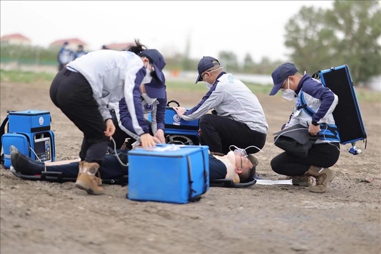 他們首先將模擬航天員抬到鏟式擔(dān)架上,迅速作出病情判斷后,立即護(hù)送進(jìn)入救護(hù)直升機(jī)??紫殄|發(fā)出指令,趙琳輸送氧氣,朱明開(kāi)始心電監(jiān)測(cè),高曉佩建立靜脈通道……。經(jīng)初步驗(yàn)傷,按照原定救治程序展開(kāi)急救……演習(xí)于第二天上午10時(shí)結(jié)束,返回駐地,大家立刻顧不上休整,又迅速對(duì)演練進(jìn)行復(fù)盤。
