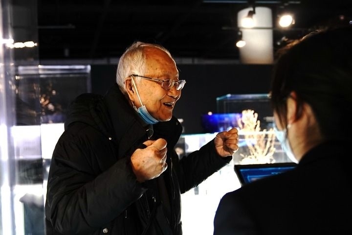 中國科學院院士汪品先在上海自然博物館舉行的“深海園林”展上介紹深海知識(2022年12月3日攝)。新華社記者 張建松 攝