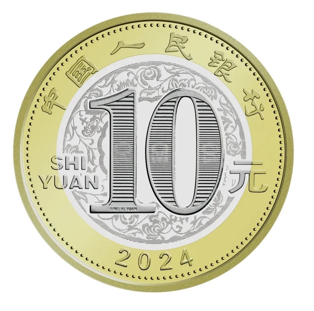 雙色銅合金紀(jì)念幣正面圖案為“中國人民銀行”、“10元”字樣,漢語拼音字母“SHIYUAN”及年號“2024”,底紋襯以團(tuán)花圖案。