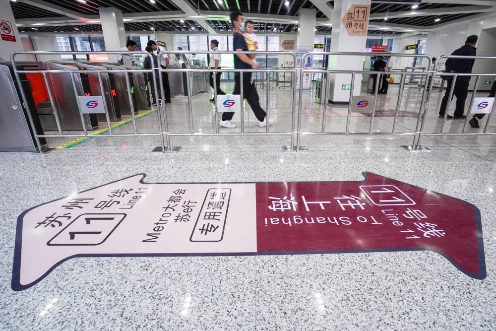 2023年6月24日,乘客在蘇州軌道交通11號(hào)線花橋站進(jìn)站乘車。當(dāng)日,蘇州軌道交通11號(hào)線正式投入運(yùn)營(yíng),并與上海軌道交通11號(hào)線實(shí)現(xiàn)無縫換乘,長(zhǎng)三角核心城市間首次實(shí)現(xiàn)地鐵系統(tǒng)跨省互聯(lián)互通。新華社記者 李博 攝