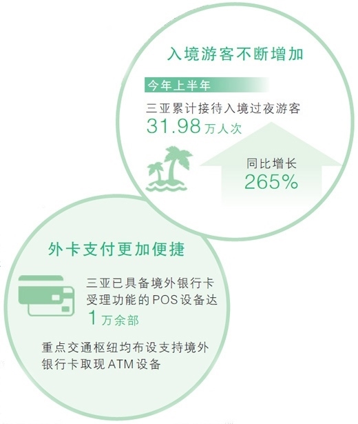 截至目前,三亞已具備境外銀行卡受理功能的POS設(shè)備達(dá)1萬(wàn)余部,全市支持境外銀行卡取現(xiàn)的ATM設(shè)備499臺(tái),貨幣代兌點(diǎn)59個(gè),現(xiàn)金“零錢包”發(fā)放超6.6萬(wàn)個(gè)。其中,機(jī)場(chǎng)、動(dòng)車站、郵輪碼頭等重點(diǎn)交通樞紐均布設(shè)支持境外銀行卡取現(xiàn)ATM設(shè)備,機(jī)場(chǎng)航站樓內(nèi)支持境外銀行卡支付商戶覆蓋率達(dá)99%,大東海旅游區(qū)周邊商戶POS設(shè)備80%以上支持境外銀行卡支付……