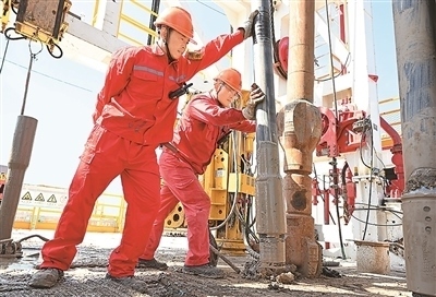 在山東省東營(yíng)市勝利油田利斜856鉆井現(xiàn)場(chǎng),勝利石油工程公司渤海50691鉆井隊(duì)員工進(jìn)行起下鉆施工,加快石油勘探開(kāi)發(fā)步伐。王國(guó)章攝(人民視覺(jué))