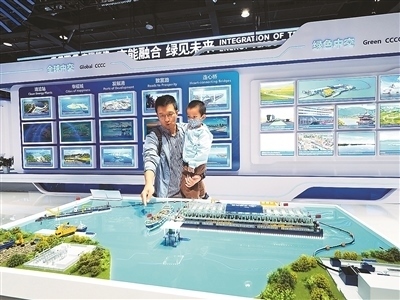 第十六屆國際交通技術(shù)與設備展覽會上,觀眾在中國交建展位參觀“太湖生態(tài)清淤工程”模型。杜建坡攝(人民圖片)