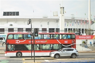 在智利首都圣地亞哥,一輛新能源公交車行駛在街頭。這條路線的十輛雙層新能源公交車由中國制造。近年來,中國制造的新能源汽車不斷進入智利市場,憑借綠色環(huán)保的特點和先進科技的應用廣受當?shù)孛癖姷那嗖A。新華社記者 辛悅衛(wèi)攝