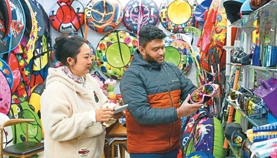 浙江義烏國際商貿(mào)城一家戶外滑雪用具店鋪內(nèi),外商在洽談、選購戶外冰雪運動裝備。