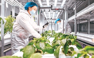 在呼和浩特市的內蒙古宇生樂谷豐現(xiàn)代農(nóng)業(yè)產(chǎn)業(yè)園久和數(shù)智植物工廠,工人正進行果蔬生產(chǎn)管理。