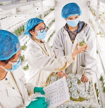 河南商丘睢縣城關鎮(zhèn)袁莊村,工作人員在實驗室內(nèi)查看草莓組培苗生長情況。