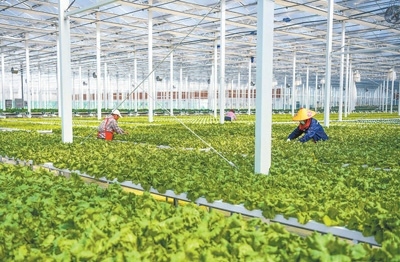 江蘇宿遷經(jīng)濟技術開發(fā)區(qū)南蔡數(shù)字農(nóng)業(yè)產(chǎn)業(yè)園溫室大棚里,村民在對蔬菜秧苗進行管護作業(yè)。
