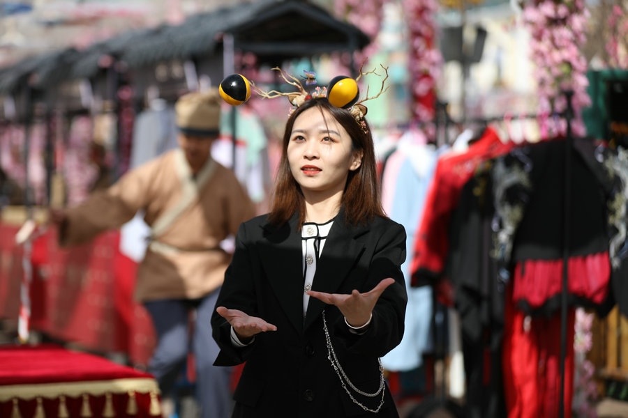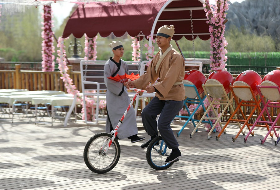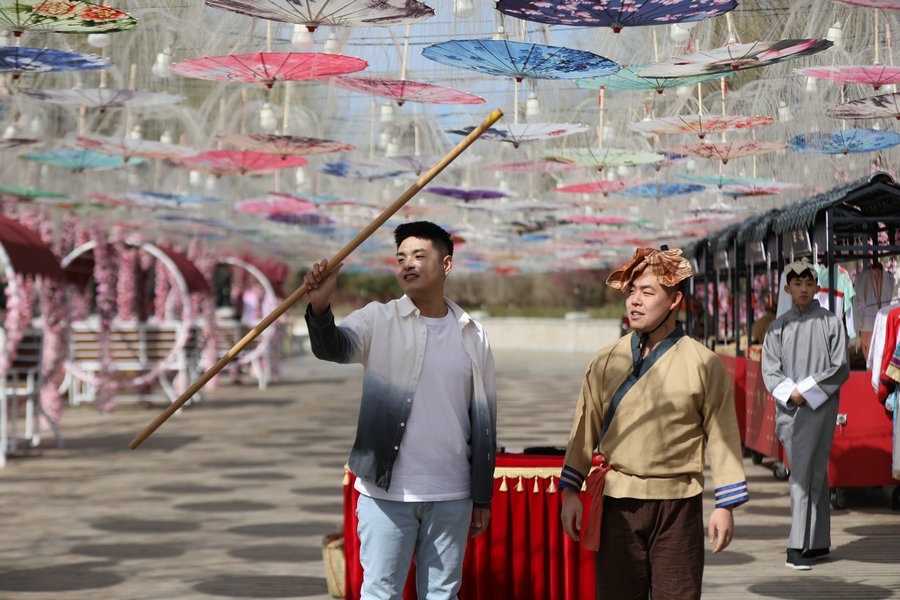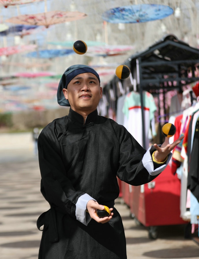 園區(qū)昔日的觀景臺,今日變身“迎春路”,花團錦簇的搖椅,五顏六色的油紙傘,身著古典裝扮的演員,精彩絕倫的雜技表演,吸引著游客艷羨的目光,引來陣陣歡呼。蹴鞠、投壺等民俗互動游戲讓游客參與其中,各色美食,令人大快朵頤,“迎春路”上春光燦爛,儼然一片歡樂的海洋。