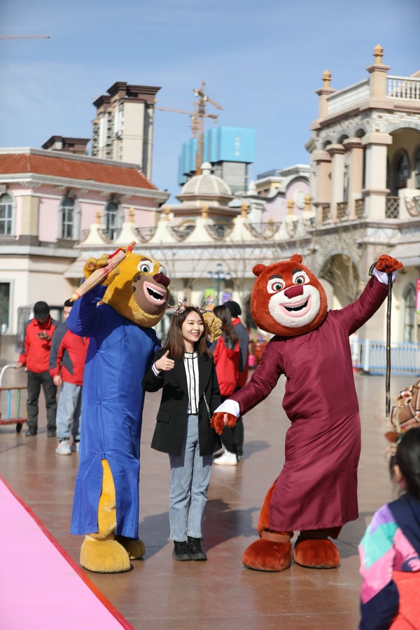 游客與“熊大”“熊二”熱情互動 記者 張楊攝影