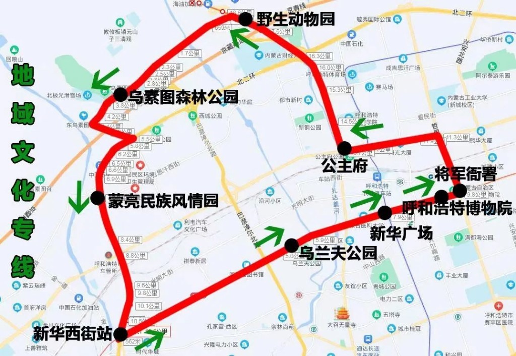 地域文化專線(新華西街站——蒙亮民族風(fēng)情園),途經(jīng):新華西街、新華大街、哲里木路、海拉爾大街、通道北路、生態(tài)路、鹽站西街、北二環(huán)輔道、西二環(huán)輔道。沿途設(shè)站:新華西街,烏蘭夫公園、新華廣場(chǎng)、呼和浩特博物院、將軍衙署、公主府、野生動(dòng)物園、烏素圖森林公園、蒙亮民族風(fēng)情,全程:29公里,配車:10臺(tái)。