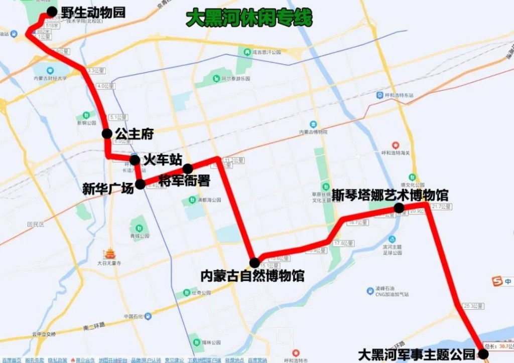 大黑河休閑專線(大青山野生動(dòng)物園——大黑河軍事主題公園),途經(jīng):Y317、通道北路、車站西街、錫林北路、新華大街、興安南路、金橋路、大黑河北岸路。沿途設(shè)站:野生動(dòng)物園、公主府、火車站、新華廣場(chǎng)、將軍衙署、內(nèi)蒙古自然博物館、斯琴塔娜藝術(shù)博物館、大黑河軍事主題公園,單程:30.7公里,配車:8—10臺(tái)。