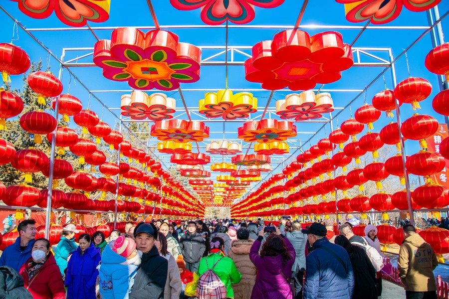 2024年2月15日,人們?cè)诤艉秃铺厥杏袢獏^(qū)塞上老街旅游休閑街區(qū)燈籠長(zhǎng)廊內(nèi)游玩。丁根厚 攝