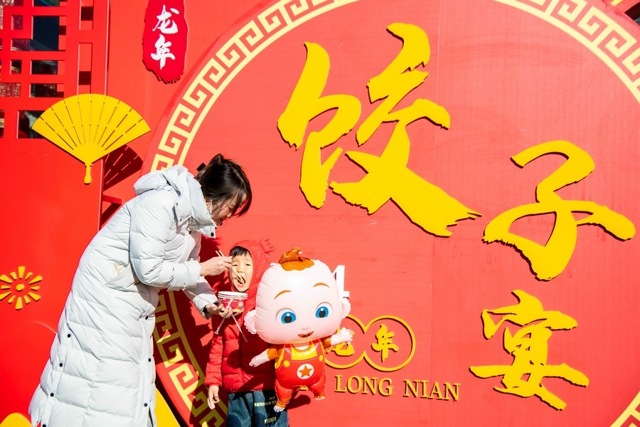 2024年2月15日,人們?cè)诤艉秃铺厥杏袢獏^(qū)塞上老街旅游休閑街區(qū)“千人餃子”品鑒活動(dòng)現(xiàn)場(chǎng)品嘗餃子。丁根厚 攝