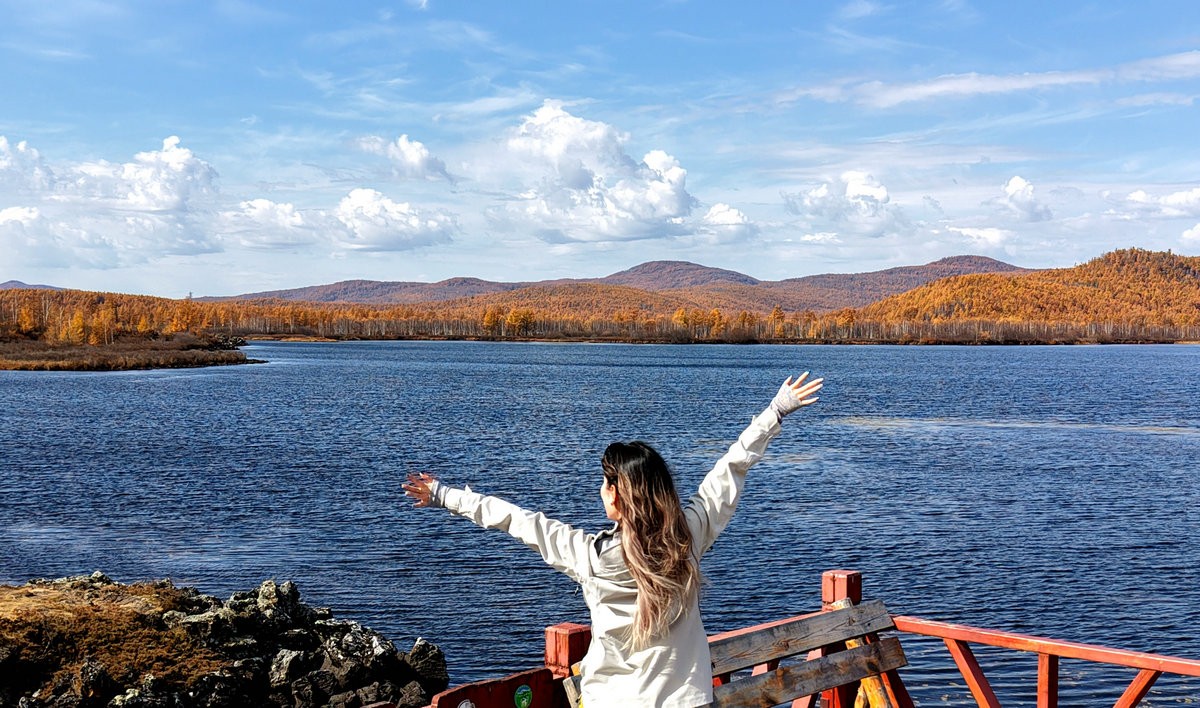 9月29日,游客在內(nèi)蒙古阿爾山國家森林公園烏蘇浪子湖邊打卡 北疆新聞?dòng)浾?張楊攝影