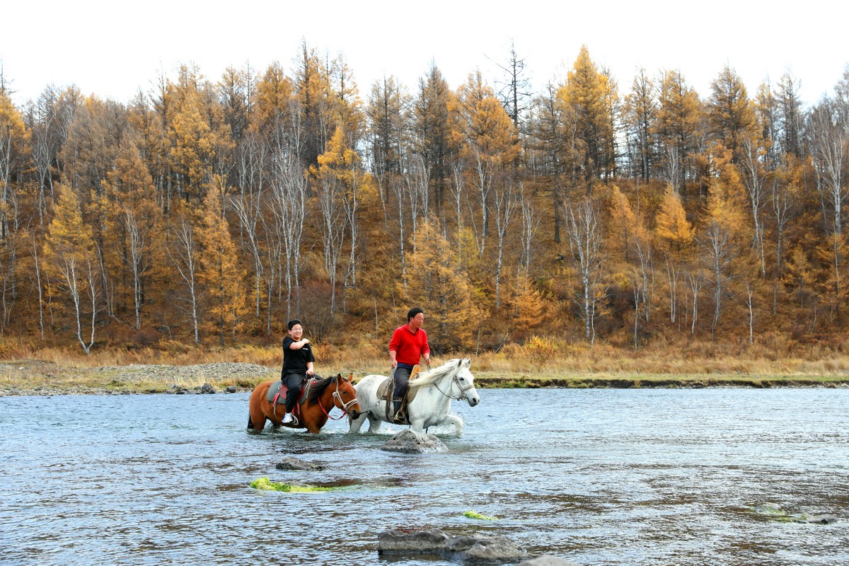 9月29日,游客在內(nèi)蒙古阿爾山國家森林公園不凍河邊體驗(yàn)騎馬 北疆新聞?dòng)浾?張楊攝影
