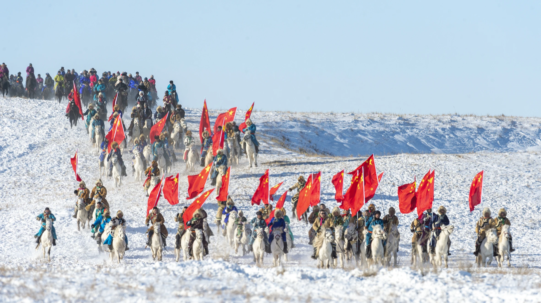 9時50分,在護旗方陣的護衛(wèi)下,鮮艷的五星紅旗冉冉升起,《義勇軍進行曲》響徹云霄,萬人肅立齊唱。方陣入場式上,200名農牧民手持火紅的辣椒、金黃的向日葵和飽滿的西瓜,用豐收的喜悅“描繪”鄉(xiāng)村振興畫卷;400名“民族大家庭”方陣成員身著五彩盛裝,恰似民族團結的斑斕錦緞;企業(yè)代表、干部職工代表、裁判、射箭手、搏克手等方陣依次入場,大家精神抖擻,昂首闊步,展現(xiàn)出全旗各族人民團結奮進的精神面貌;最令人心潮澎湃的當數(shù)蒙古馬方陣——百匹駿馬踏著《黑駿馬》的悠揚琴聲奔騰而來,馬蹄卷起草浪,鬃毛飛揚如旗,將北疆兒女的豪邁氣概演繹得淋漓盡致。