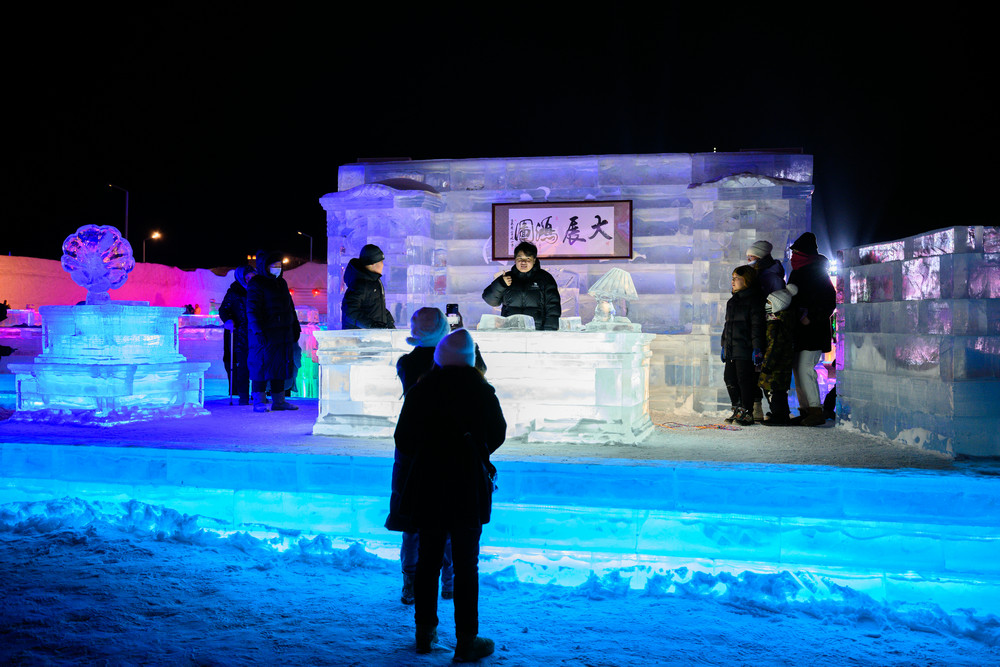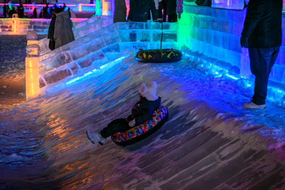 園區(qū)內(nèi)更是熱鬧非凡。中式“北國第一門”、俄式童話城堡、蒙式游牧風(fēng)情三大特色入口,成了游客打卡的首選地。258米長的中式主題雪墻鋪展著“萬里茶道”的傳奇故事,復(fù)古火車站、蒸汽機車雪雕復(fù)刻著中東鐵路的舊時光,隨手一拍都是自帶氛圍感的大片。冰雪滑梯、雪地碰碰球等十余項娛樂項目前排起了長隊,大人小孩都玩得不亦樂乎;蒙古包暖屋里,熱氣騰騰的奶茶、鮮燉烤梨香氣四溢,暖心又暖胃。科技感拉滿了游玩體驗,不少游客拿著手機掃碼體驗語言冰書冰墻,中俄蒙常用語一學(xué)就會,還有炫彩音樂噴泉冰柱打造互動琴鍵裝置,時光之門光幕呈現(xiàn)科幻特效。