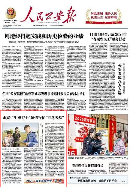2026年1月25日《人民公安報》頭版刊發(fā)了《金亮:“生態(tài)衛(wèi)士”傾情守護“百鳥天堂”》的文章,報道了內(nèi)蒙古扎賚特旗公安局圖牧吉國家級自然保護區(qū)森林公安派出所所長金亮的故事。作為一名當?shù)氐摹吧鷳B(tài)衛(wèi)士”,金亮與保護區(qū)相伴的24年,參與辦理治安案件2000余起、刑事案件400余起,查處違法犯罪嫌疑人2600余名。金亮用實際行動踐行著“守護好祖國北疆綠水青山”的偉大使命。
