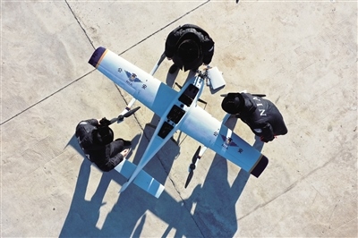 測(cè)量、加油、調(diào)試、升空……隨著螺旋槳高速轉(zhuǎn)動(dòng),一架 “鷹眼”固定翼無人機(jī)騰空而起,劃破北疆寂靜的天空,以每小時(shí)110公里的速度沿著邊管區(qū)巡航。