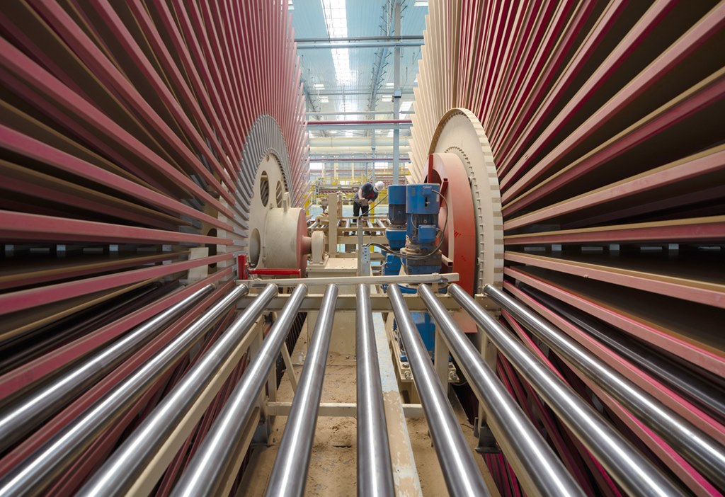 工人在河北省唐山市曹妃甸區(qū)金隅天壇(唐山)木業(yè)科技有限公司的生產(chǎn)線上工作,該企業(yè)為北京金隅天壇家具股份有限公司全資子公司(2020年8月17日攝)。