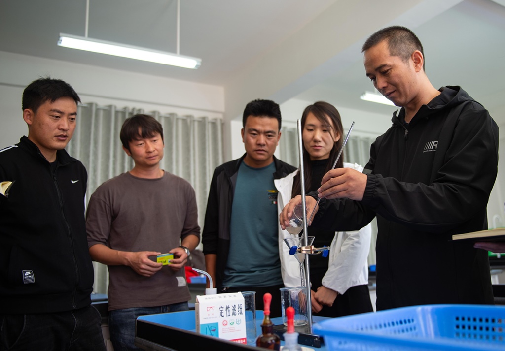 北京市援青支教教師、來自通州區(qū)陸辛莊學(xué)校的化學(xué)教師祁生貴(右一)在青海省玉樹州第四民族高級(jí)中學(xué)指導(dǎo)學(xué)校教師進(jìn)行實(shí)驗(yàn)教學(xué)(2020年8月12日攝)。新華社記者 陳鐘昊 攝