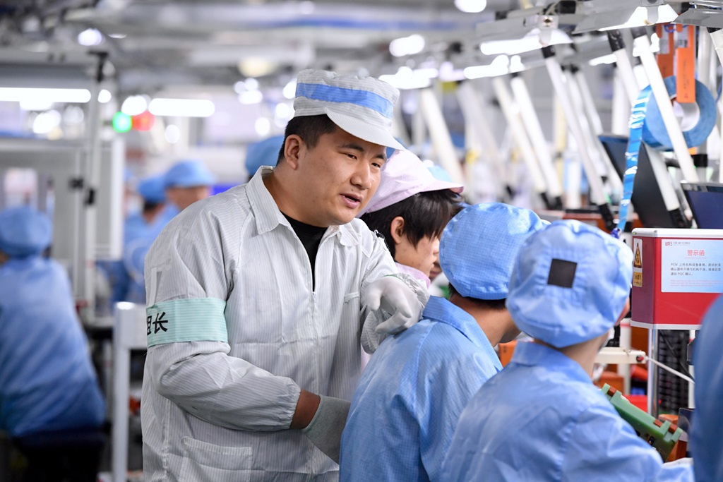 寧夏青年陳滿庫在飛毛腿(福建)電子有限公司車間指導(dǎo)工人操作(2021年2月3日攝)。