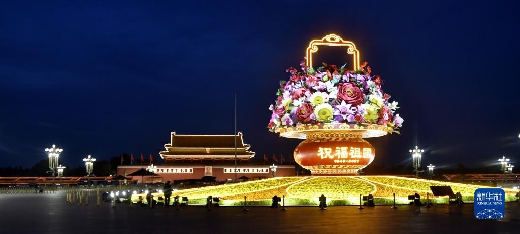 夜晚天安門廣場(chǎng)上的“祝福祖國(guó)”主題花壇(9月27日攝) 新華社記者 李欣 攝