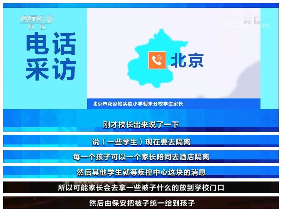 北京市花家地實(shí)驗(yàn)小學(xué)朝來分校 學(xué)生家長:現(xiàn)在應(yīng)該是做完核酸檢測,在等結(jié)果了。老師在群里面會通知我們,孩子可能明天開始線上上課。