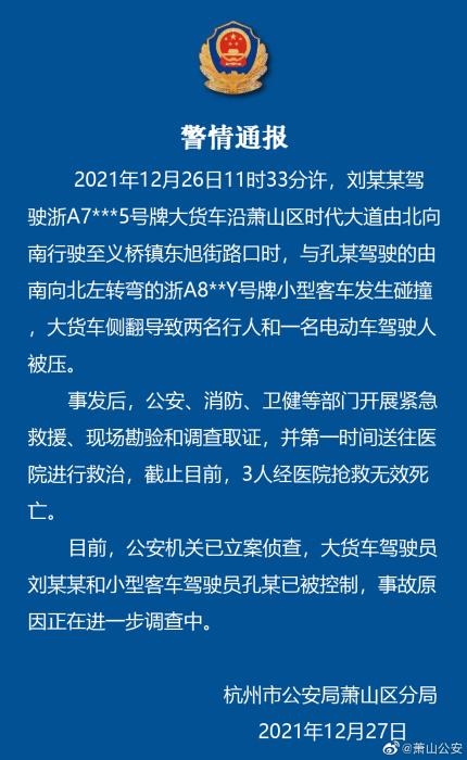 中新網(wǎng)12月27日電 杭州市公安局蕭山區(qū)分局27日通報,12月26日11時33分許,一大貨車與一小型客車在蕭山區(qū)一路口發(fā)生碰撞,大貨車側(cè)翻導致兩名行人和一名電動車駕駛?cè)吮粔骸=刂聊壳埃?人經(jīng)醫(yī)院搶救無效死亡。
