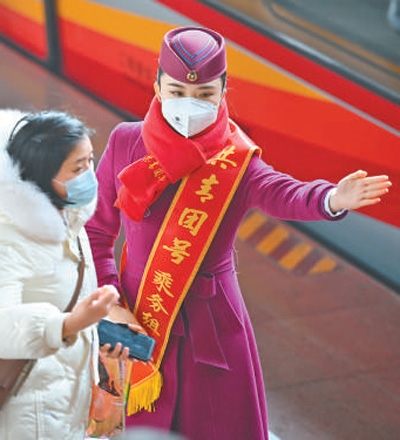 春運首日,成渝高鐵“復興號”智能動車組“共青團號”列車首發(fā),這是全國首次在“復興號”智能動車組中常態(tài)化開行“共青團號”列車,列車將開展常態(tài)化志愿服務(wù)。圖為志愿者服務(wù)旅客乘車。