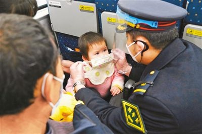南昌客運段“井岡山號”列車乘務(wù)人員積極開展“暖心春運”行動,通過貼喜慶窗花、贈小旅客愛心手環(huán)和卡通口罩等一系列溫馨舉措,把溫暖送到旅客身邊。圖為乘務(wù)人員為小旅客贈送愛心口罩。