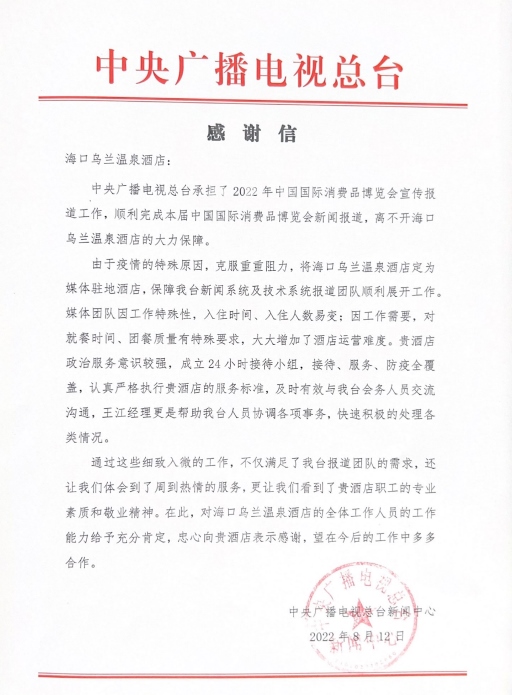 中央廣播電視總臺順利完成了在海南召開的2022年中國國際消費品博覽會的新聞報道,離不開??跒跆m溫泉酒店的大力保障。媒體團隊因工作特殊性,入住時間、入住人數(shù)易變;對就餐時間、團餐質(zhì)量有特殊要求,大大增加了酒店運營難度。貴酒店政治服務意識較強,成立24小時接待小組,接待、服務、防疫全覆蓋,及時有效與我臺會務人員交流溝通,通過細致入微的工作,不僅滿足了我臺報道團隊的需求,還讓我們體會到了周到熱情的服務,更讓我們看到了貴酒店職工的專業(yè)素質(zhì)和敬業(yè)精神。在此,對??跒跆m溫泉酒店的全體工作人員的工作能力給予充分肯定,衷心向貴酒店表示感謝。