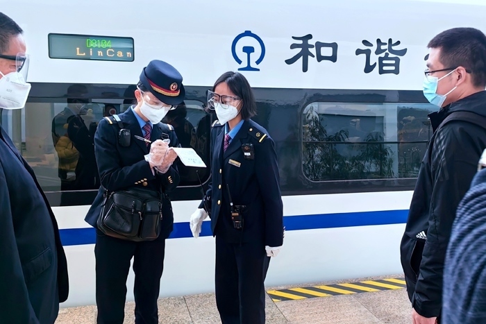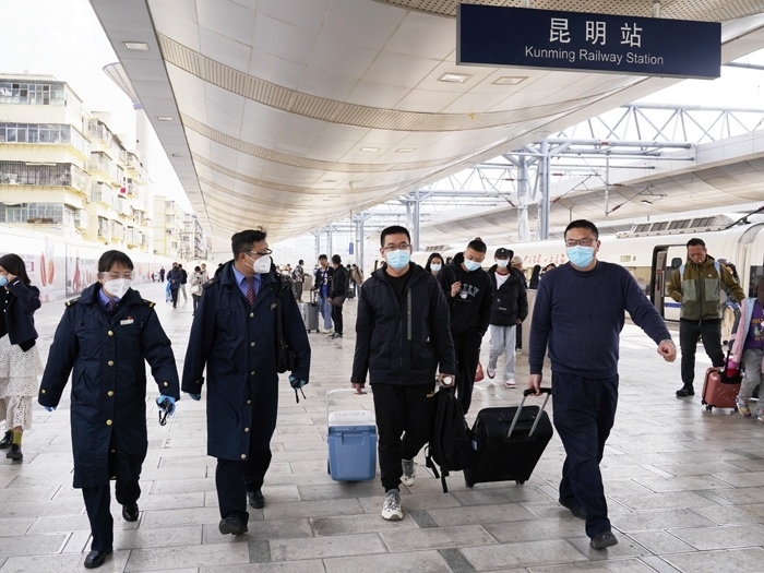 云縣站工作人員引導(dǎo)醫(yī)務(wù)人員進(jìn)入站臺(tái)乘坐動(dòng)車。中國(guó)鐵路昆明局集團(tuán)有限公司供圖