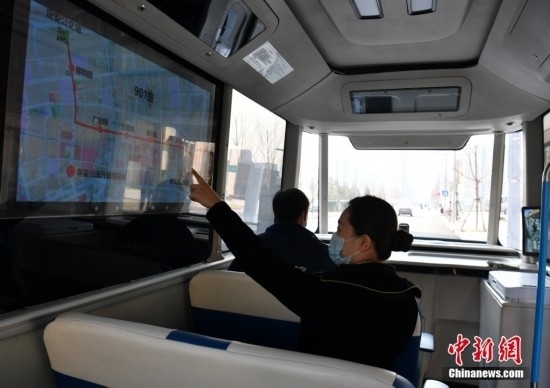 2月22日,智能網(wǎng)聯(lián)巴士901線測試車輛測試員正在介紹公交路線。雄安新區(qū)的智能網(wǎng)聯(lián)巴士近期正在進(jìn)行投入運(yùn)營前的道路測試,該巴士配備了超高感度攝像頭、超聲波雷達(dá)、激光雷達(dá)、毫米波雷達(dá)等感知設(shè)備,組成了車輛的“眼睛”。車輛可自主識別紅綠燈、道路提示牌和車道標(biāo)線等,做出跟車、超車、停車等動作。中新社記者 韓冰 攝