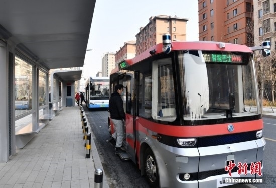2月22日,智能網(wǎng)聯(lián)巴士901線測試車輛停靠公交站臺。雄安新區(qū)的智能網(wǎng)聯(lián)巴士近期正在進(jìn)行投入運(yùn)營前的道路測試,該巴士配備了超高感度攝像頭、超聲波雷達(dá)、激光雷達(dá)、毫米波雷達(dá)等感知設(shè)備,組成了車輛的“眼睛”。車輛可自主識別紅綠燈、道路提示牌和車道標(biāo)線等,做出跟車、超車、停車等動作。中新社記者 韓冰 攝