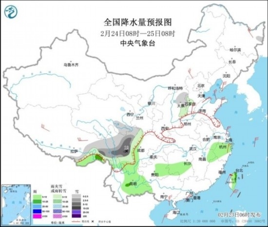 全國降水量預(yù)報圖(2月23日08時-24日08時)。圖片來源:中央氣象臺網(wǎng)站