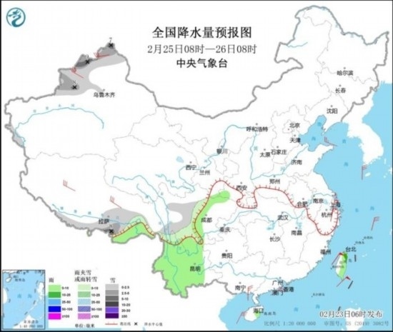 2月25日08時至26日08時,新疆西北部、西藏南部、川西高原等地的部分地區(qū)有小到中雪或雨夾雪,其中新疆北部山區(qū)及伊犁河谷等地局地大雪(5~9毫米);四川西南部、云南中西部、西藏東南部、臺灣島等地的部分地區(qū)有小到中雨。新疆西北部、西藏中部、浙江、廣西南部等地的部分地區(qū)有4~6級風(fēng)。臺灣海峽有8~9級、陣風(fēng)10級的東北風(fēng),東海南部、南海有7~8級、陣風(fēng)9級的東北風(fēng)。