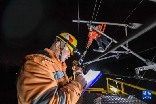 2月23日,一名綜合維修工在滬寧城際高鐵南京站至仙林站區(qū)間記錄接觸網(wǎng)檢修維護情況。