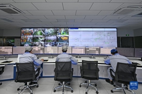 在天津海河乳品有限公司智能化生產(chǎn)線控制中心內(nèi),工作人員在監(jiān)控生產(chǎn)線運轉(zhuǎn)情況(2月20日攝)。