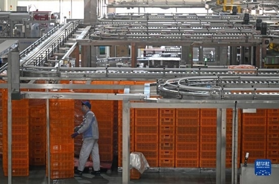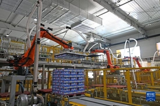 在天津海河乳品有限公司智能化生產(chǎn)線,智能生產(chǎn)設備在轉(zhuǎn)運貨物(2月20日攝)。