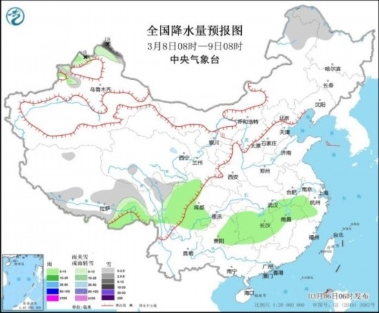 3月8日08時(shí)至9日08時(shí),新疆西北部、內(nèi)蒙古東北部、黑龍江西北部、西藏南部、川西高原北部等地部分地區(qū)有小到中雪或雨夾雪,其中,新疆西北部等地部分地區(qū)有大到暴雪(10~18毫米);西藏東南部、四川中部、貴州東部、湖南大部、江西北部等地部分地區(qū)有小雨。內(nèi)蒙古中部、遼東半島等地部分地區(qū)有4~6級(jí)風(fēng)(見圖3)。